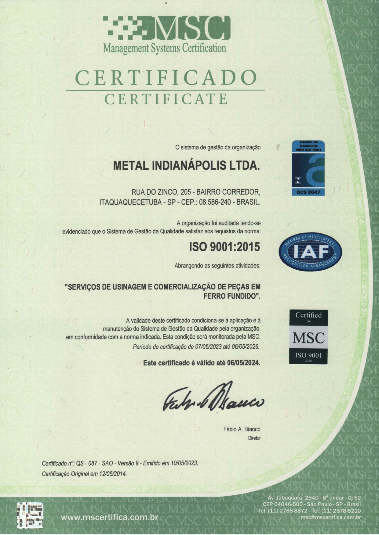 A Metalúrgica Indianápolis assegura que os processos sejam executados em estrita observância aos procedimentos estabelecidos pelo seu Sistema de Gestão da Qualidade.